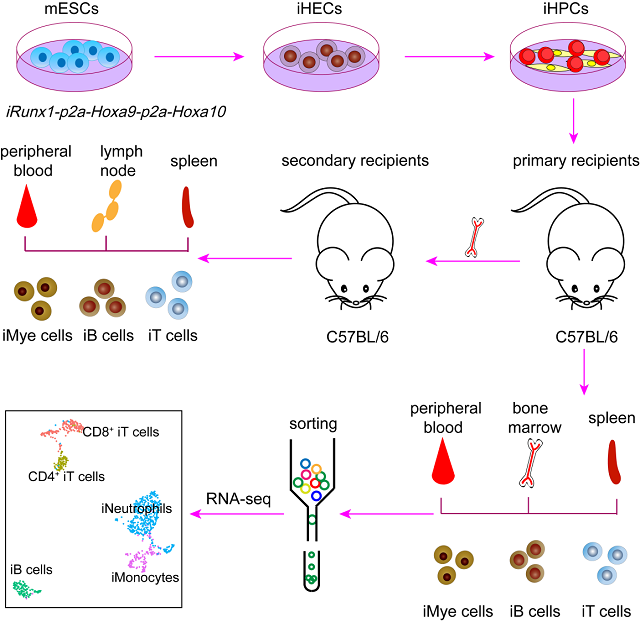 2023年2月16日,來自中國科學(xué)院廣州生物醫(yī)藥與健康研究院的王金勇研究團(tuán)隊(duì)和廣州醫(yī)科大學(xué)的張夢云研究團(tuán)隊(duì)合作,在Stem Cell Reports上發(fā)表了題為Prolonged generation of multi-lineage blood cells in wild type animals from pluripotent stem cells的研究論文,首次報(bào)道了通過干細(xì)胞基因編輯手段操縱Runx1、Hoxa9和Hoxa10基因組合表達(dá),高效誘導(dǎo)多能干細(xì)胞(PSC)定向分化再生造血種子細(xì)胞(induced hematopoietic progenitor cells, iHPCs)。iHPCs移植后能在野生型(先天和獲得性免疫系統(tǒng)正常)受體鼠中穩(wěn)定嵌合長達(dá)6個(gè)月以上時(shí)間,輸出完整的髓系細(xì)胞、B細(xì)胞和T細(xì)胞等細(xì)胞譜系,實(shí)現(xiàn)長期、穩(wěn)定多譜系造血重建,且未發(fā)現(xiàn)致瘤現(xiàn)象。