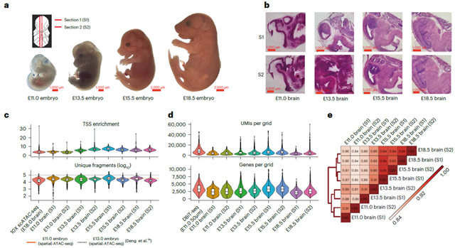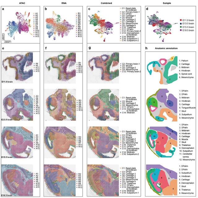 圖2. E11.0, E13.5, E15.5 和E18.5小鼠腦的空間基因表達、染色質(zhì)可及性以及結(jié)合二者的空間圖譜