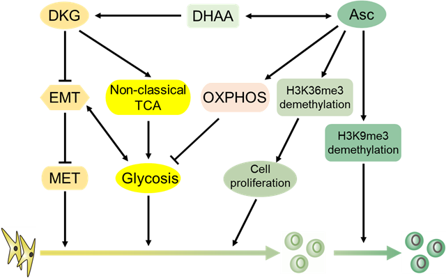 研究團(tuán)隊(duì)分別采用Vc及其代謝產(chǎn)物DHAA和DKG等處理體細(xì)胞重編程,發(fā)現(xiàn)Vc表現(xiàn)出通過(guò)DKG依賴途徑和非依賴途徑促進(jìn)重編程的雙重能力。一方面,Vc通過(guò)DKG非依賴的途徑促進(jìn)細(xì)胞增殖,并誘導(dǎo)pre- iPSCs向iPSCs轉(zhuǎn)化,從而促進(jìn)重編程。另一方面,Vc通過(guò)DKG依賴機(jī)制觸發(fā)間充質(zhì)-上皮轉(zhuǎn)化(MET)并激活糖酵解。值得注意的是,DKG激活了以增加琥珀酸、延胡索酸和蘋(píng)果酸為特征的非典型三羧酸循環(huán),促使細(xì)胞代謝從氧化磷酸化(OXPHOS)向糖酵解轉(zhuǎn)變。此外,由于其抗氧化能力,Vc抑制糖酵解,從而阻止糖酵解與上皮-間質(zhì)轉(zhuǎn)化(EMT)之間的正反饋,最終導(dǎo)致更高水平的MET。