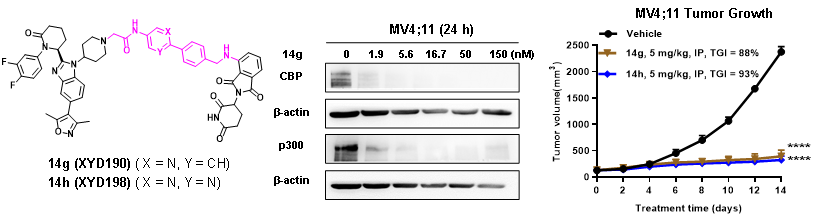 許永團隊長期致力于CBP/p300小分子抑制劑的研究,并獲得了系統(tǒng)性的研究成果(Eur.?J.?Med.?Chem.?2018;Acta Pharmacol.?Sin.?2019;J. Med. Chem.?2022;Bioorg. Chem.?2024)。然而,CBP/p300小分子抑制劑會面臨兩個問題:(1)化合物長期暴露會導致耐藥;(2)化合物單獨靶向CBP/p300的HAT或BRD域可能無法完全消除其功能。因此,迫切需要一種新的策略,以獲得更有效的治療。