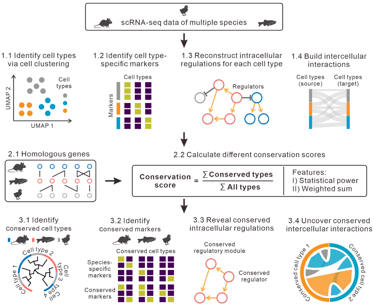 物種不僅在基因?qū)用妫苍诩毎愋?、基因表達、基因調(diào)控、細胞間相互作用等方面顯示出進化保守性。單細胞轉(zhuǎn)錄組測序技術(shù)已廣泛用于不同物種的單細胞表達研究,為在細胞類型水平研究物種的進化保守性提供了新機會。已有的算法能通過分析跨物種單細胞轉(zhuǎn)錄組數(shù)據(jù)識別進化保守的細胞類型,如Seurat和SAMap等。但是,這些方法主要通過跨物種的單細胞聚類確定保守細胞類型,其準(zhǔn)確性在很大程度上取決于跨物種批次效應(yīng)校正的能力。這些軟件對進化距離較遠物種進行聚類分析,仍存在明顯不足。此外,目前仍沒有方法能確定細胞間相互作用的進化保守性。
