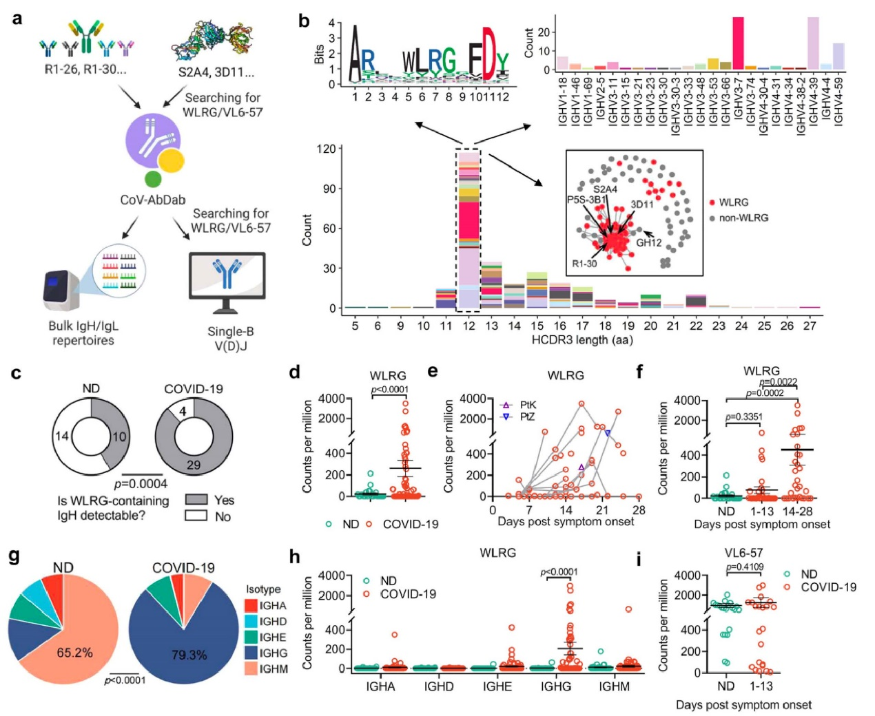 比對(duì)R1-26的結(jié)構(gòu),蛋白數(shù)據(jù)庫(PDB)分析發(fā)現(xiàn),近10個(gè)結(jié)構(gòu)已解析的4類抗體的輕鏈均由VL6-57編碼。這些VL6-57抗體通過相似的HCDR3疏水性基序和LCDR1的“NY”基序與RBD上371-373-375位點(diǎn)定義的趨同表位相互作用。冠狀病毒抗體數(shù)據(jù)庫(CoV-AbDab)分析顯示,VL6-57抗體的HCDR3富含“WLRG”基序,LCDR3富含“QSYDSS”基序。進(jìn)一步的抗體組庫分析發(fā)現(xiàn),含“WLRG”基序的IgH序列在新冠感染和健康人群中均存在,但在感染后顯著擴(kuò)增并發(fā)生類別轉(zhuǎn)換,而含“QSYDSS”基序的VL6-57輕鏈在兩組中的表達(dá)水平相當(dāng)。這些結(jié)果表明,在新冠病毒刺激下,表達(dá)VL6-57抗體的na?veB細(xì)胞被激活并發(fā)生克隆擴(kuò)增和類別轉(zhuǎn)換,在近90%的新冠感染者中誘導(dǎo)了VL6-57類人群抗體。