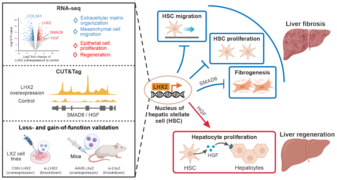 圖2?LHX2在肝纖維化和再生中調(diào)控作用的示意圖。通過轉(zhuǎn)錄組(RNA-seq)、蛋白結(jié)合的DNA位點(diǎn)檢測(cè)技術(shù)(CUT&Tag)以及敲降和過表達(dá)功能實(shí)驗(yàn),揭示了LHX2能夠抑制肝星狀細(xì)胞遷移、增殖和纖維生成,同時(shí)通過調(diào)控HGF的分泌促進(jìn)肝細(xì)胞增殖。