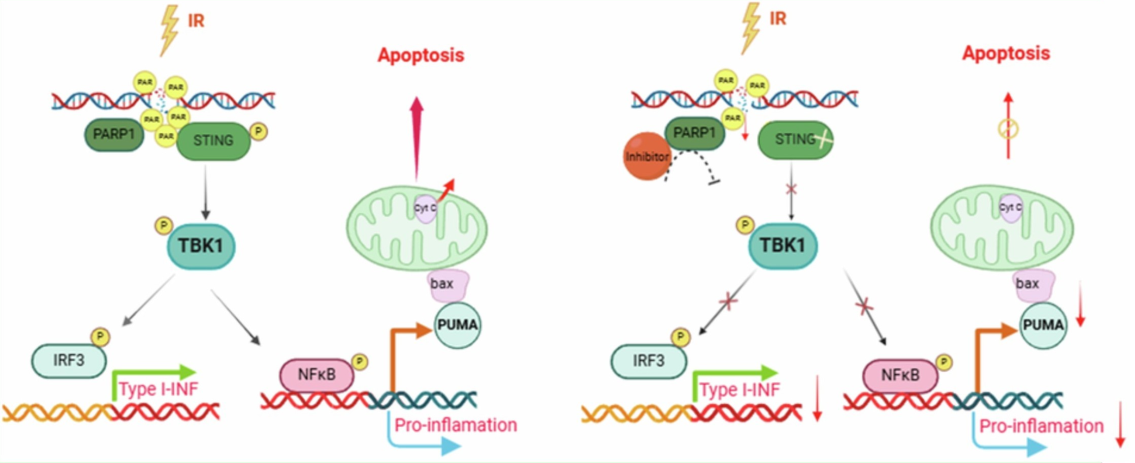 研究人員通過體內(nèi)和體外實(shí)驗(yàn)研究了STING如何響應(yīng)DNA輻射損傷,輻射導(dǎo)致的 DNA損傷可以激活PARP1蛋白,進(jìn)而誘導(dǎo)PAR(多聚核糖)的過度合成,從而觸發(fā)STING蛋白介導(dǎo)的細(xì)胞死亡。對(duì)于STING基因缺陷的小鼠,對(duì)其腹部輻射后,相對(duì)于正常小鼠,存活率提升5倍,從11%躍升至67%,腸道病理?yè)p傷顯著減輕。通過給予低劑量的PARP1(聚腺苷二磷酸核糖聚合酶)抑制劑PJ34來下調(diào)PAR的合成,則可以抑制STING激活,可以觀察到類似于在STING基因缺陷小鼠中觀察到的現(xiàn)象。這些結(jié)果揭示了PARP1-PAR-STING通路在輻射誘導(dǎo)的細(xì)胞凋亡途徑中的關(guān)鍵作用。