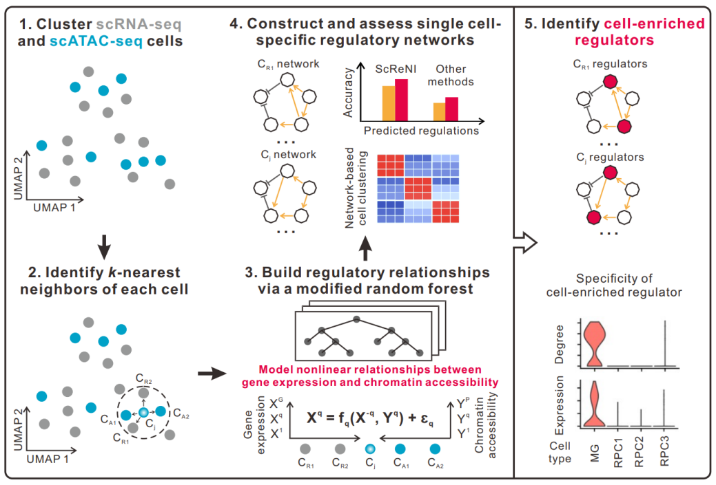 近日,中國科學院廣州生物醫(yī)藥與健康研究院王杰課題組與廣州國家實驗室李亦學課題組合作,成功開發(fā)了一種在單細胞水平構建調控網(wǎng)絡的新工具ScReNI(Single-cell Regulatory Network Inference)。該工具通過整合單細胞轉錄組(scRNA-seq)與單細胞染色質可及性(scATAC-seq)數(shù)據(jù),實現(xiàn)單細胞精度的基因調控網(wǎng)絡推斷。相關研究成果以題為“ScReNI: Single-cell Regulatory Network Inference Through Integrating scRNA-seq and scATAC-seq Data”的論文形式發(fā)表于國際學術期刊《Genomics, Proteomics & Bioinformatics》。