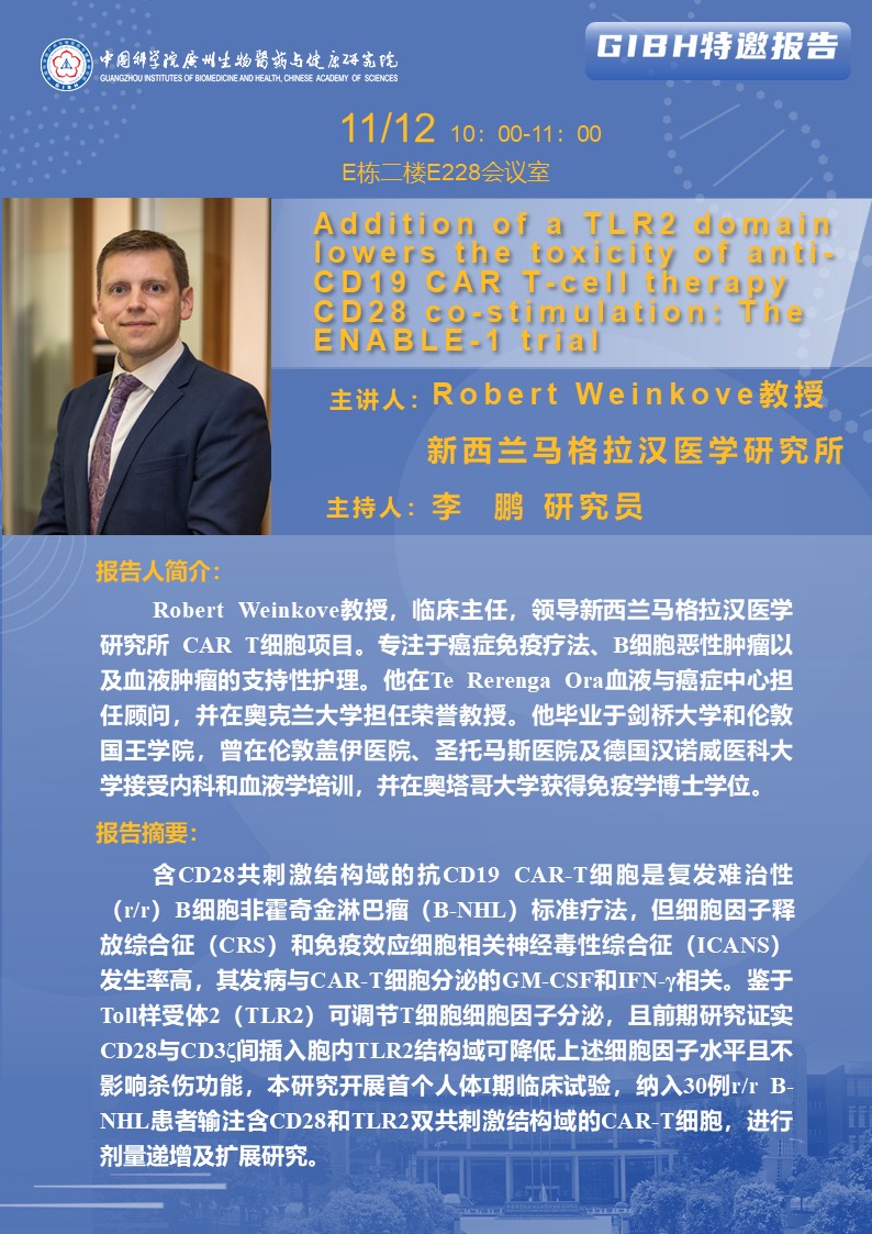 2025年11月12日特邀報(bào)告:Addition of a TLR2 domain lowers the toxicity of anti-CD19 CAR T-cell therapy CD28 co-stimulation: The ENABLE-1 trial