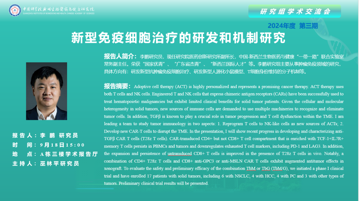 2024年9月18日研究組學(xué)術(shù)交流會(2024年第三期):新型免疫細(xì)胞治療的研發(fā)和機(jī)制研究