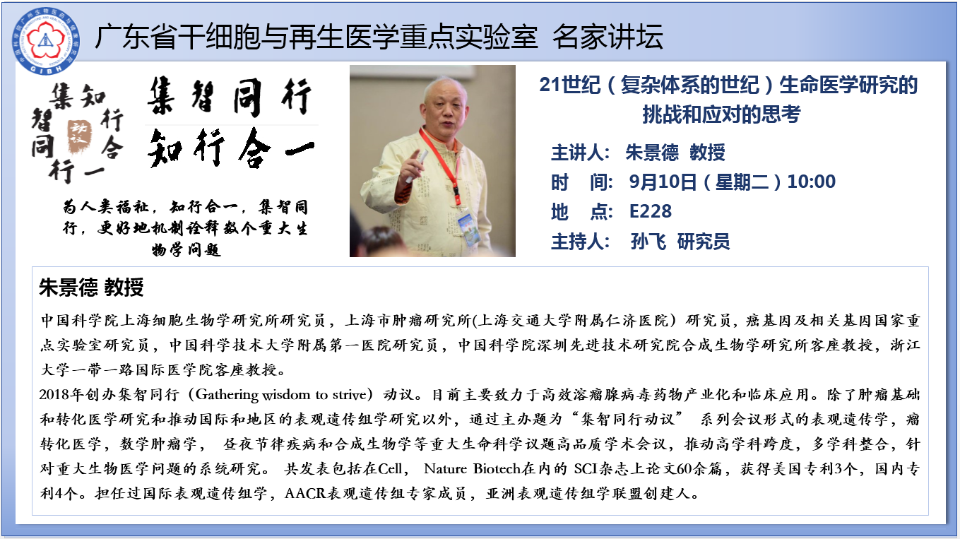 2024年9月10日廣東省干細胞與再生醫(yī)學重點實驗室名家講壇:21世紀(復雜體系的世紀)生命醫(yī)學研究的挑戰(zhàn)和應對的思考