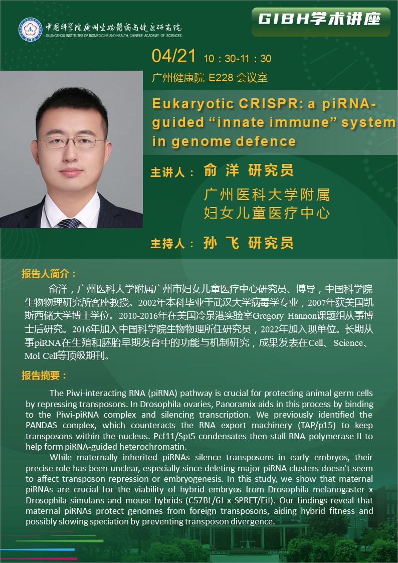 2025年4月21日學術(shù)講座:Eukaryotic CRISPR: a piRNA-guided “innate immune”system in genome defence