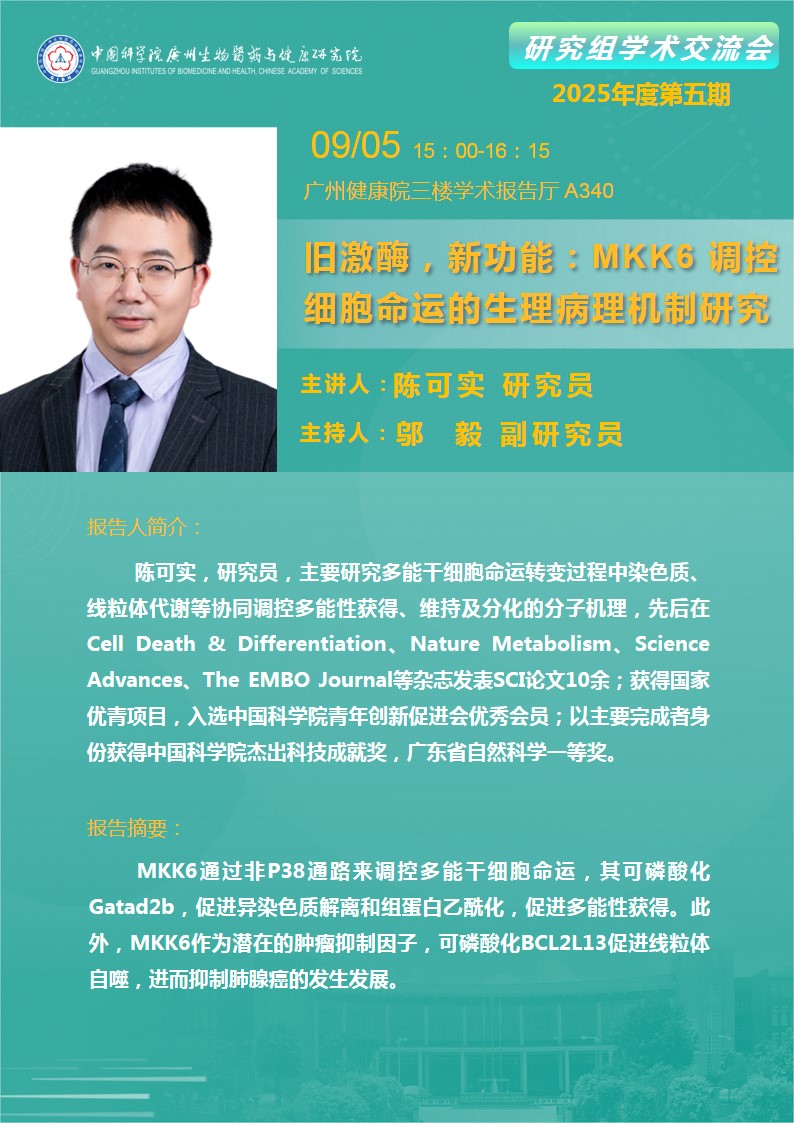 2025年5月9日研究組學(xué)術(shù)交流會(2025年度第五期):舊激酶,新功能:MKK6 調(diào)控細胞命運的生理病理機制研究