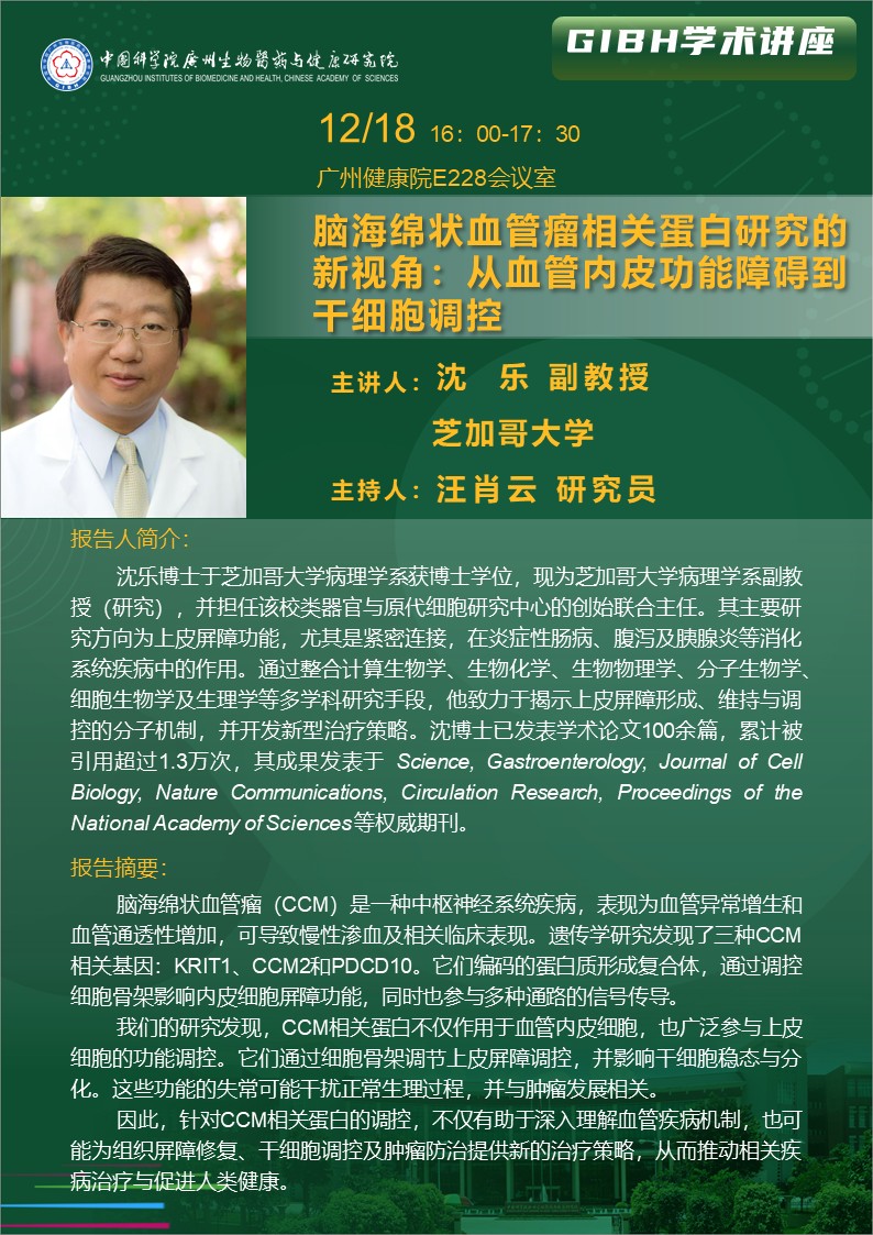 2025年12月18日學(xué)術(shù)講座:腦海綿狀血管瘤相關(guān)蛋白研究的新視角:從血管內(nèi)皮功能障礙到干細(xì)胞調(diào)控